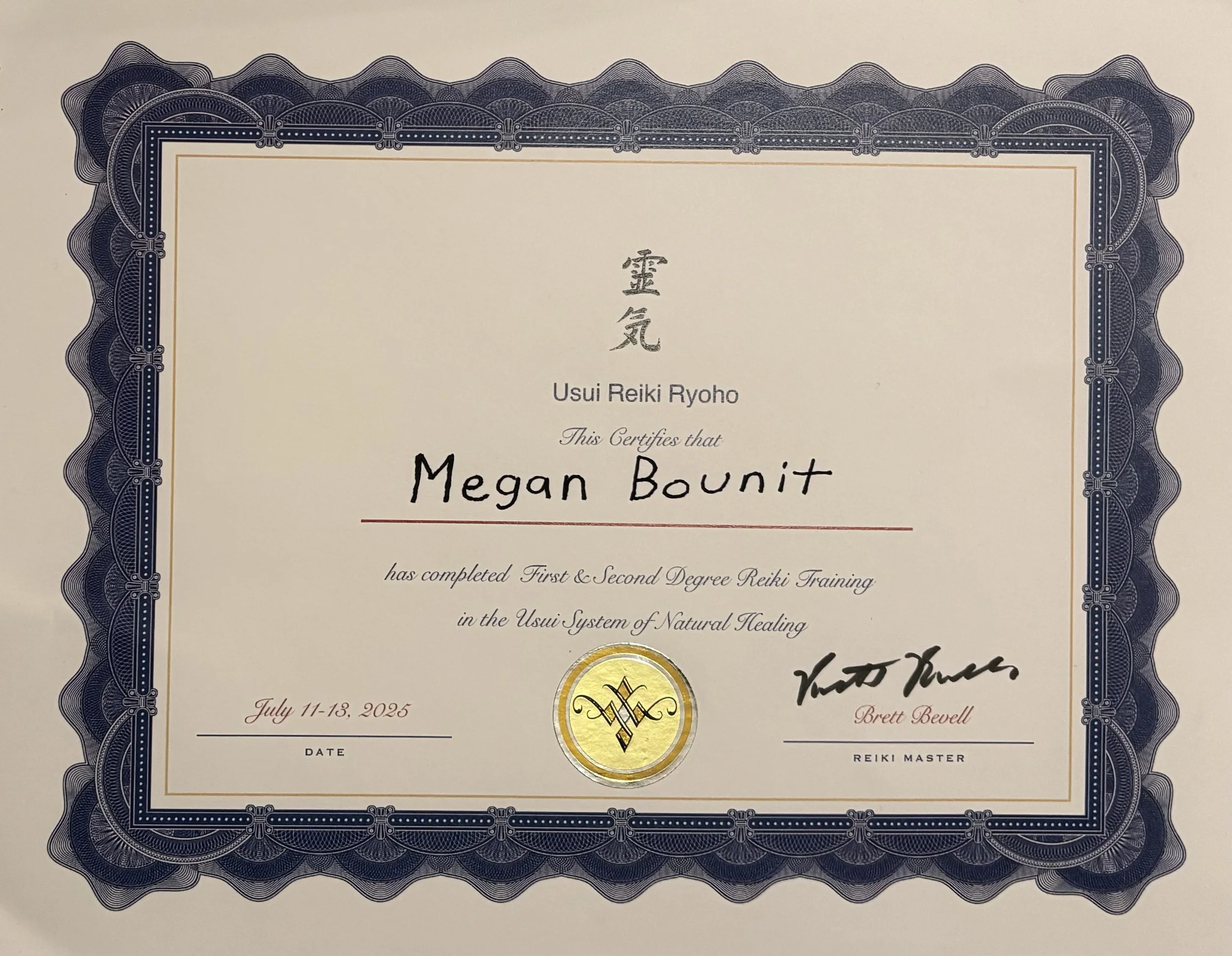 I completed Reiki level 1, Reiki level 2, and Psychic Reiki training with Brett and will soon be a Reiki Master.